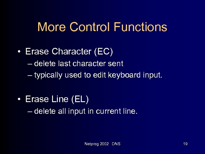 More Control Functions • Erase Character (EC) – delete last character sent – typically used to edit keyboard input. • Erase Line (EL) – delete all input in current line. Netprog 2002 DNS 19