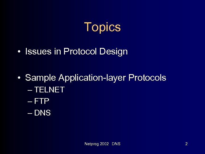 Topics • Issues in Protocol Design • Sample Application-layer Protocols – TELNET – FTP – DNS Netprog 2002 DNS 2