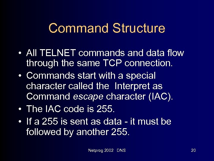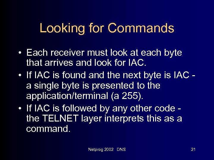 Command Structure • All TELNET commands and data flow through the same TCP connection. • Commands start with a special character called the Interpret as Command escape character (IAC). • The IAC code is 255. • If a 255 is sent as data - it must be followed by another 255. Netprog 2002 DNS 20