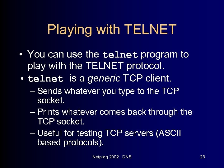 Command Codes • • • IP AO AYT EC EL 243 244 245 246 247 WILL n WON’T n DON’T n IAC n Netprog 2002 DNS 251 252 253 254 255 22
