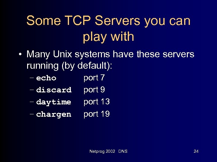 Some TCP Servers you can play with • Many Unix systems have these servers running (by default): – echo – discard – daytime – chargen port 7 port 9 port 13 port 19 Netprog 2002 DNS 24