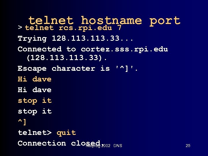 telnet hostname port > telnet rcs. rpi. edu 7 Trying 128. 113. 33. . . Connected to cortez. sss. rpi. edu (128. 113. 33). Escape character is '^]'. Hi dave stop it ^] telnet> quit Connection closed. DNS Netprog 2002 25