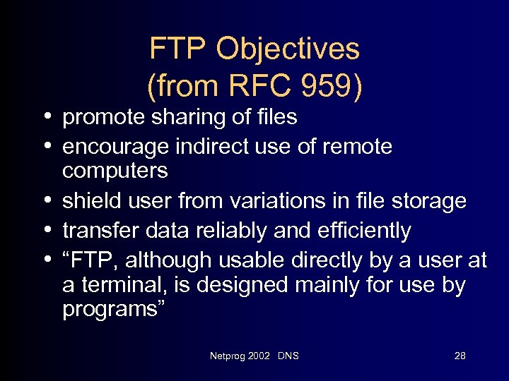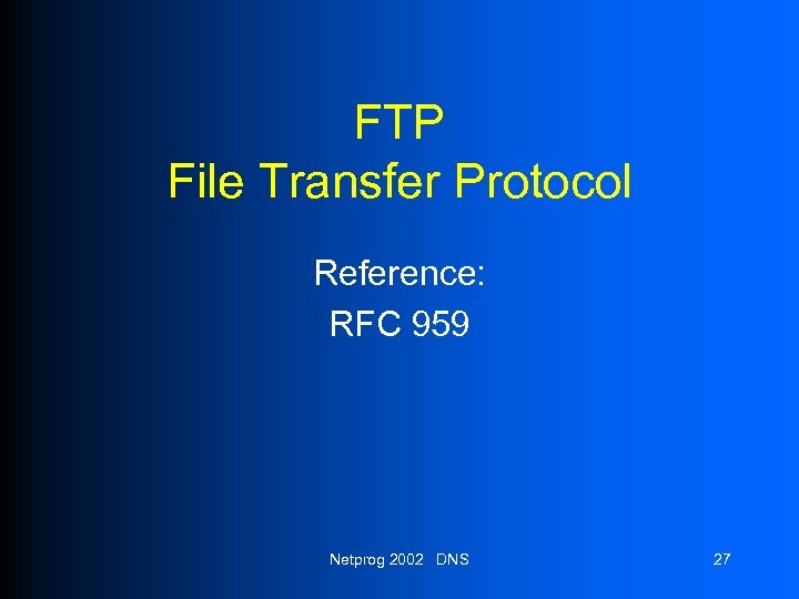 FTP File Transfer Protocol Reference: RFC 959 Netprog 2002 DNS 27
