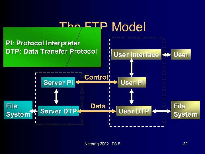 FTP Objectives (from RFC 959) • promote sharing of files • encourage indirect use of remote computers • shield user from variations in file storage • transfer data reliably and efficiently • “FTP, although usable directly by a user at a terminal, is designed mainly for use by programs” Netprog 2002 DNS 28