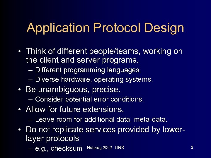 Application Protocol Design • Think of different people/teams, working on the client and server programs. – Different programming languages. – Diverse hardware, operating systems. • Be unambiguous, precise. – Consider potential error conditions. • Allow for future extensions. – Leave room for additional data, meta-data. • Do not replicate services provided by lowerlayer protocols – e. g. , checksum Netprog 2002 DNS 3