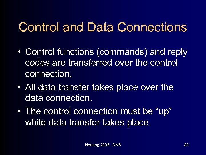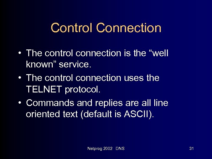 Control and Data Connections • Control functions (commands) and reply codes are transferred over the control connection. • All data transfer takes place over the data connection. • The control connection must be “up” while data transfer takes place. Netprog 2002 DNS 30