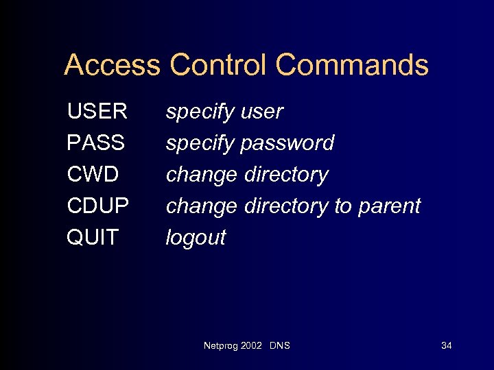 Access Control Commands USER PASS CWD CDUP QUIT specify user specify password change directory to parent logout Netprog 2002 DNS 34
