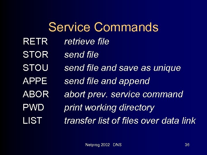 Service Commands RETR STOU APPE ABOR PWD LIST retrieve file send file and save as unique send file and append abort prev. service command print working directory transfer list of files over data link Netprog 2002 DNS 36