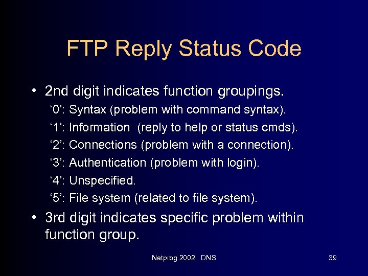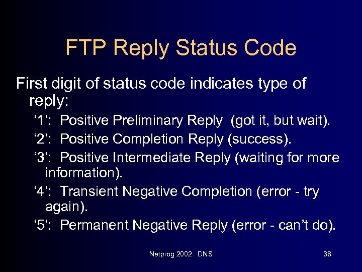 FTP Reply Status Code First digit of status code indicates type of reply: ‘ 1’: Positive Preliminary Reply (got it, but wait). ‘ 2’: Positive Completion Reply (success). ‘ 3’: Positive Intermediate Reply (waiting for more information). ‘ 4’: Transient Negative Completion (error - try again). ‘ 5’: Permanent Negative Reply (error - can’t do). Netprog 2002 DNS 38