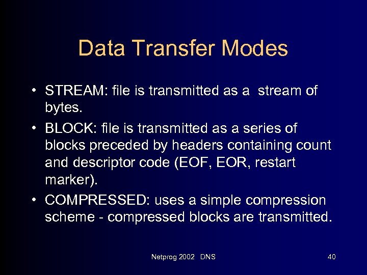 Data Transfer Modes • STREAM: file is transmitted as a stream of bytes. • BLOCK: file is transmitted as a series of blocks preceded by headers containing count and descriptor code (EOF, EOR, restart marker). • COMPRESSED: uses a simple compression scheme - compressed blocks are transmitted. Netprog 2002 DNS 40