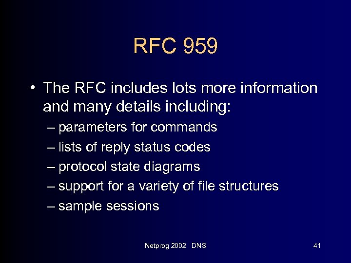 RFC 959 • The RFC includes lots more information and many details including: – parameters for commands – lists of reply status codes – protocol state diagrams – support for a variety of file structures – sample sessions Netprog 2002 DNS 41