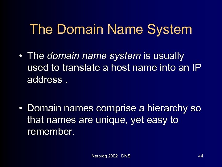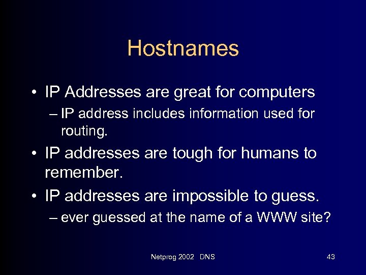 Hostnames • IP Addresses are great for computers – IP address includes information used for routing. • IP addresses are tough for humans to remember. • IP addresses are impossible to guess. – ever guessed at the name of a WWW site? Netprog 2002 DNS 43