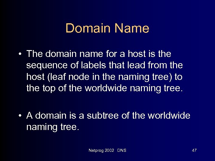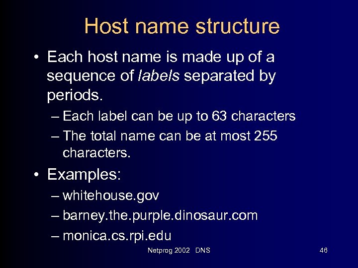 Host name structure • Each host name is made up of a sequence of labels separated by periods. – Each label can be up to 63 characters – The total name can be at most 255 characters. • Examples: – whitehouse. gov – barney. the. purple. dinosaur. com – monica. cs. rpi. edu Netprog 2002 DNS 46