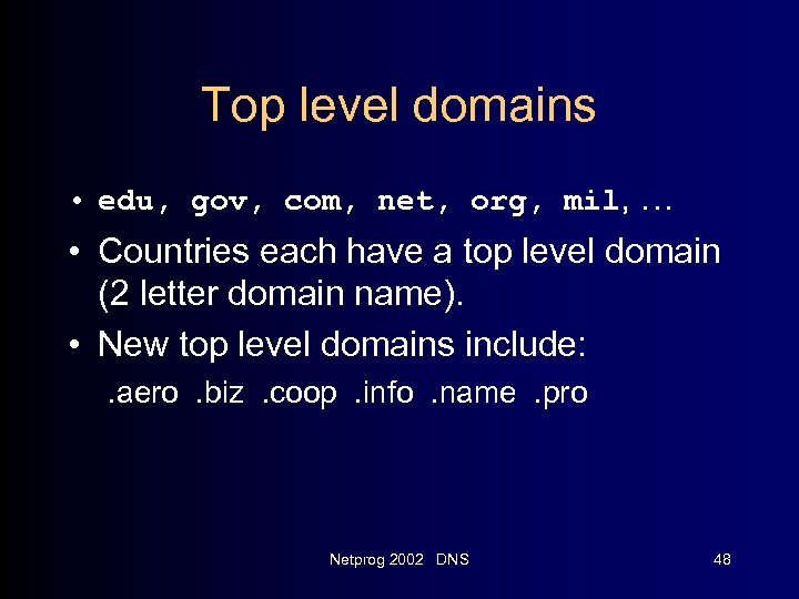 Top level domains • edu, gov, com, net, org, mil, … • Countries each have a top level domain (2 letter domain name). • New top level domains include: . aero. biz. coop. info. name. pro Netprog 2002 DNS 48