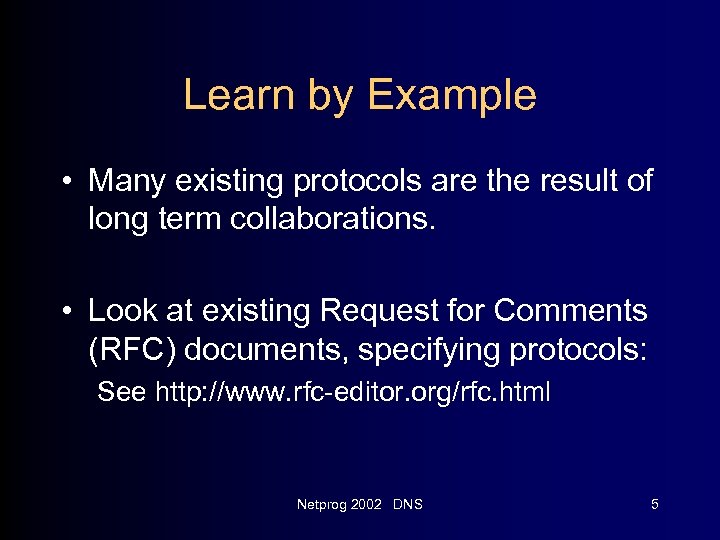 Learn by Example • Many existing protocols are the result of long term collaborations. • Look at existing Request for Comments (RFC) documents, specifying protocols: See http: //www. rfc-editor. org/rfc. html Netprog 2002 DNS 5