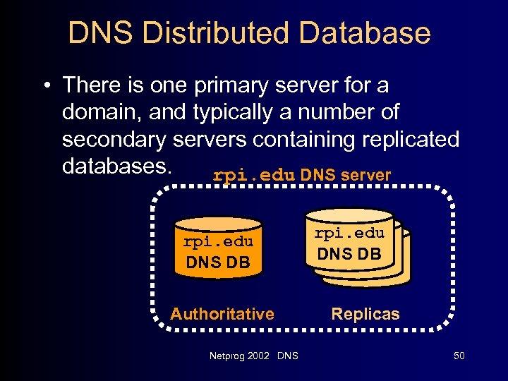 DNS Distributed Database • There is one primary server for a domain, and typically a number of secondary servers containing replicated databases. rpi. edu DNS server rpi. edu DNS DB Authoritative Netprog 2002 DNS rpi. edu DNS DB Replicas 50