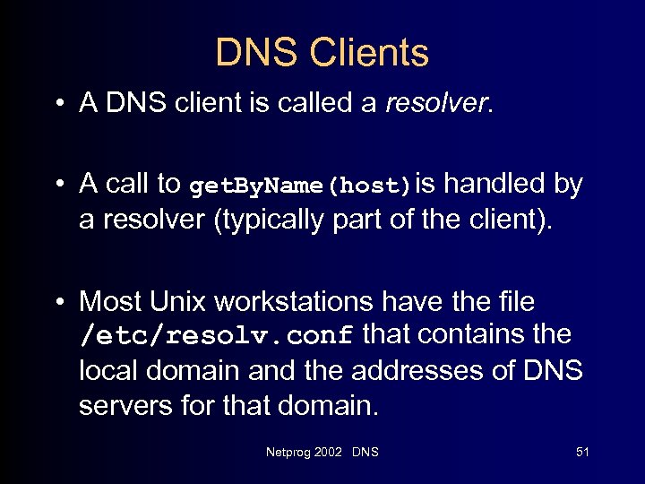 DNS Clients • A DNS client is called a resolver. • A call to get. By. Name(host)is handled by a resolver (typically part of the client). • Most Unix workstations have the file /etc/resolv. conf that contains the local domain and the addresses of DNS servers for that domain. Netprog 2002 DNS 51