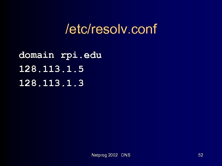 /etc/resolv. conf domain rpi. edu 128. 113. 1. 5 128. 113. 1. 3 Netprog 2002 DNS 52