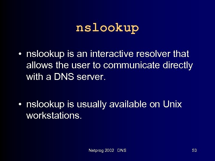 nslookup • nslookup is an interactive resolver that allows the user to communicate directly with a DNS server. • nslookup is usually available on Unix workstations. Netprog 2002 DNS 53