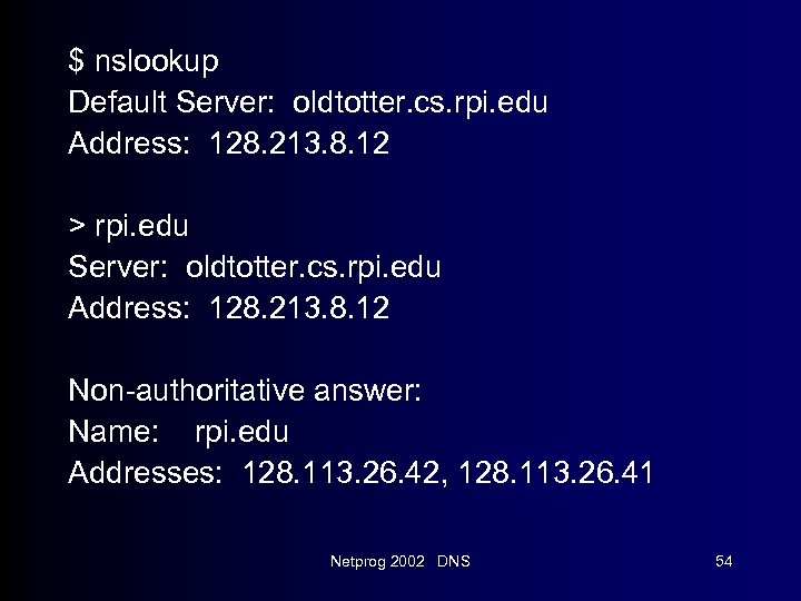 $ nslookup Default Server: oldtotter. cs. rpi. edu Address: 128. 213. 8. 12 > rpi. edu Server: oldtotter. cs. rpi. edu Address: 128. 213. 8. 12 Non-authoritative answer: Name: rpi. edu Addresses: 128. 113. 26. 42, 128. 113. 26. 41 Netprog 2002 DNS 54