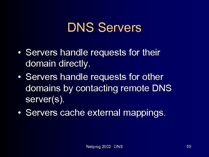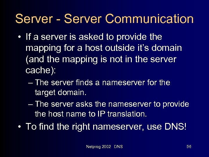 DNS Servers • Servers handle requests for their domain directly. • Servers handle requests for other domains by contacting remote DNS server(s). • Servers cache external mappings. Netprog 2002 DNS 55