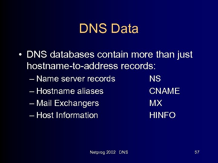 Server - Server Communication • If a server is asked to provide the mapping for a host outside it’s domain (and the mapping is not in the server cache): – The server finds a nameserver for the target domain. – The server asks the nameserver to provide the host name to IP translation. • To find the right nameserver, use DNS! Netprog 2002 DNS 56