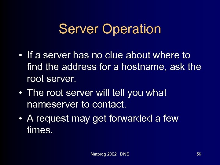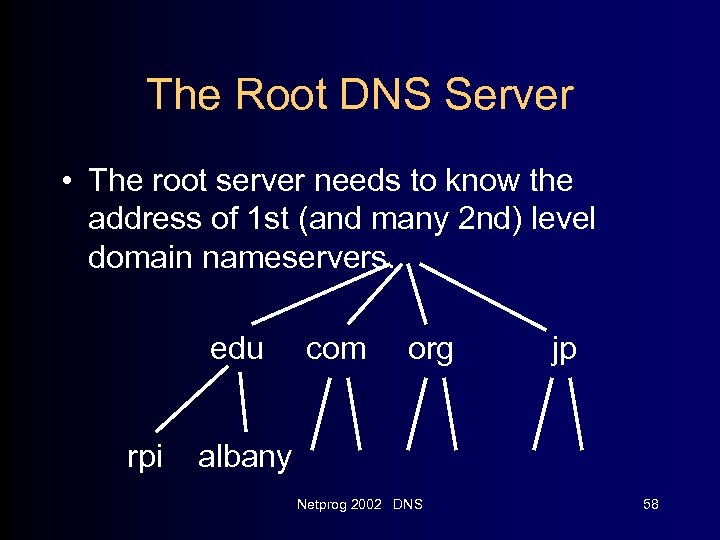The Root DNS Server • The root server needs to know the address of 1 st (and many 2 nd) level domain nameservers. edu rpi com org jp albany Netprog 2002 DNS 58