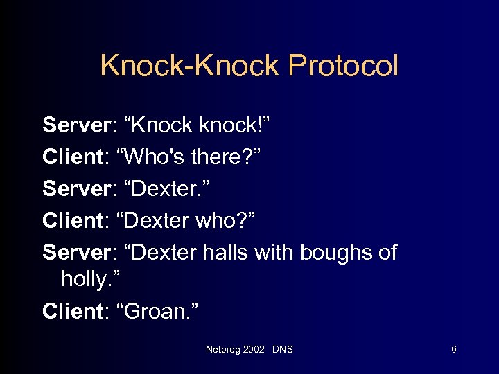 Knock-Knock Protocol Server: “Knock knock!” Client: “Who's there? ” Server: “Dexter. ” Client: “Dexter who? ” Server: “Dexter halls with boughs of holly. ” Client: “Groan. ” Netprog 2002 DNS 6
