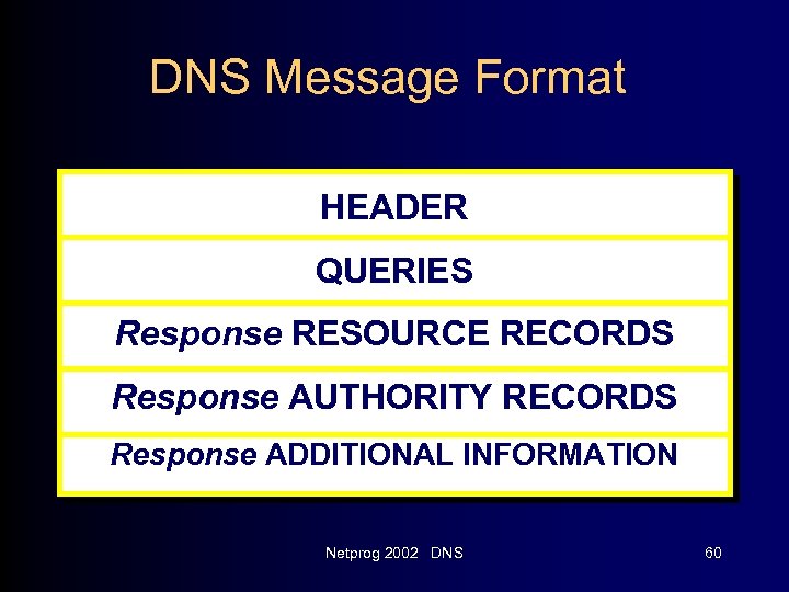 DNS Message Format HEADER QUERIES Response RESOURCE RECORDS Response AUTHORITY RECORDS Response ADDITIONAL INFORMATION Netprog 2002 DNS 60