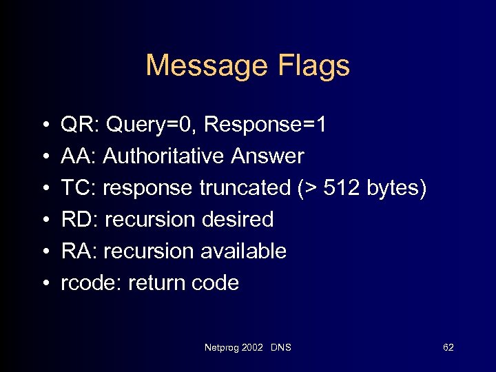 Message Flags • • • QR: Query=0, Response=1 AA: Authoritative Answer TC: response truncated (> 512 bytes) RD: recursion desired RA: recursion available rcode: return code Netprog 2002 DNS 62