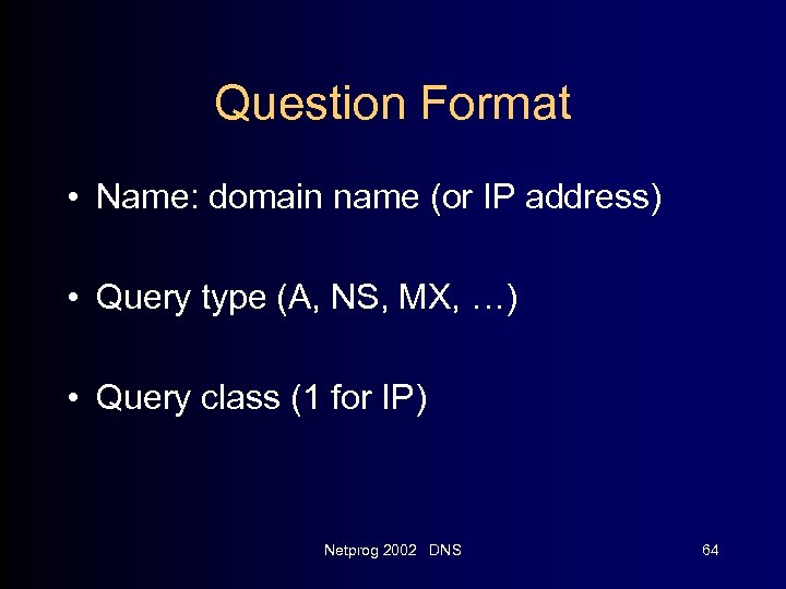 Question Format • Name: domain name (or IP address) • Query type (A, NS, MX, …) • Query class (1 for IP) Netprog 2002 DNS 64