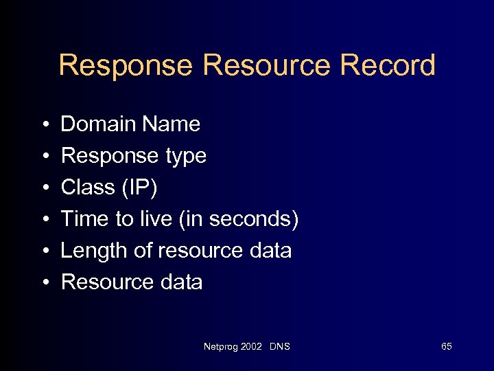Response Resource Record • • • Domain Name Response type Class (IP) Time to live (in seconds) Length of resource data Resource data Netprog 2002 DNS 65