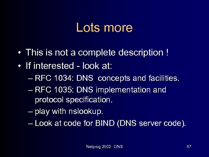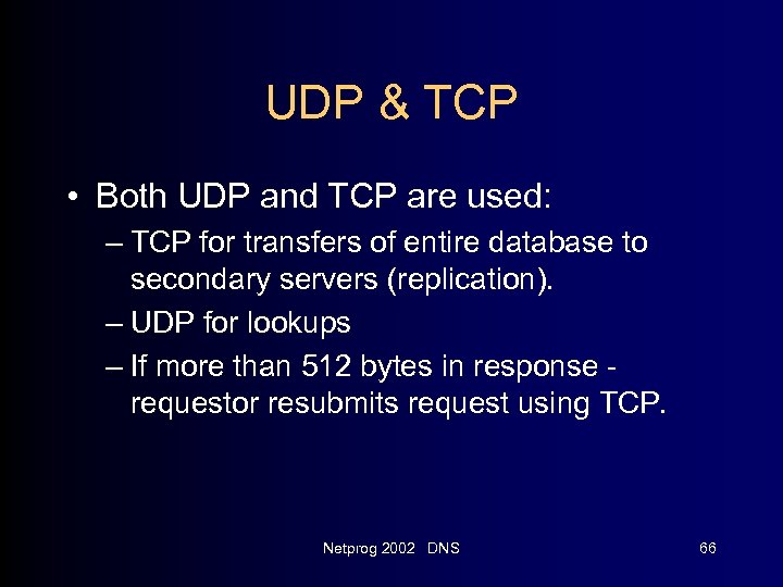 UDP & TCP • Both UDP and TCP are used: – TCP for transfers of entire database to secondary servers (replication). – UDP for lookups – If more than 512 bytes in response requestor resubmits request using TCP. Netprog 2002 DNS 66