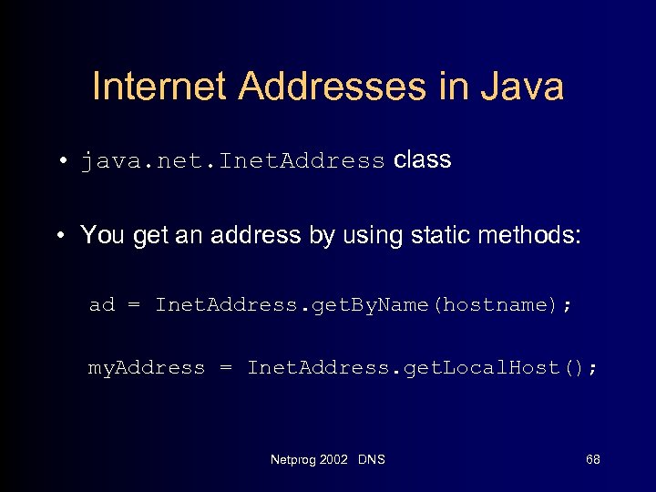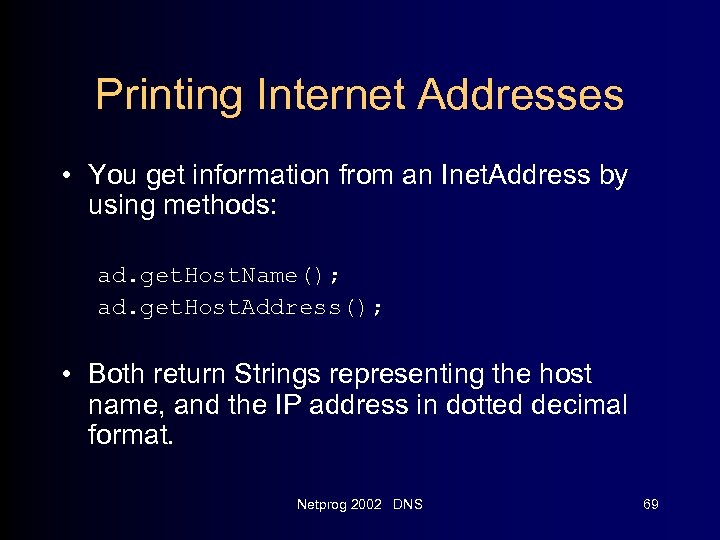 Internet Addresses in Java • java. net. Inet. Address class • You get an address by using static methods: ad = Inet. Address. get. By. Name(hostname); my. Address = Inet. Address. get. Local. Host(); Netprog 2002 DNS 68