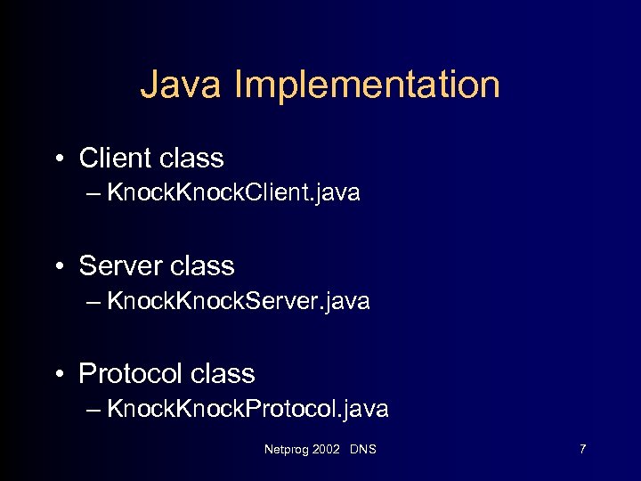 Java Implementation • Client class – Knock. Client. java • Server class – Knock. Server. java • Protocol class – Knock. Protocol. java Netprog 2002 DNS 7