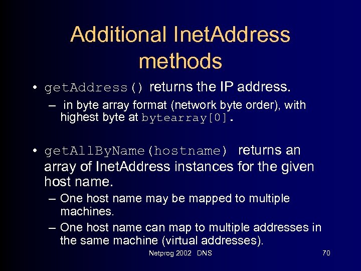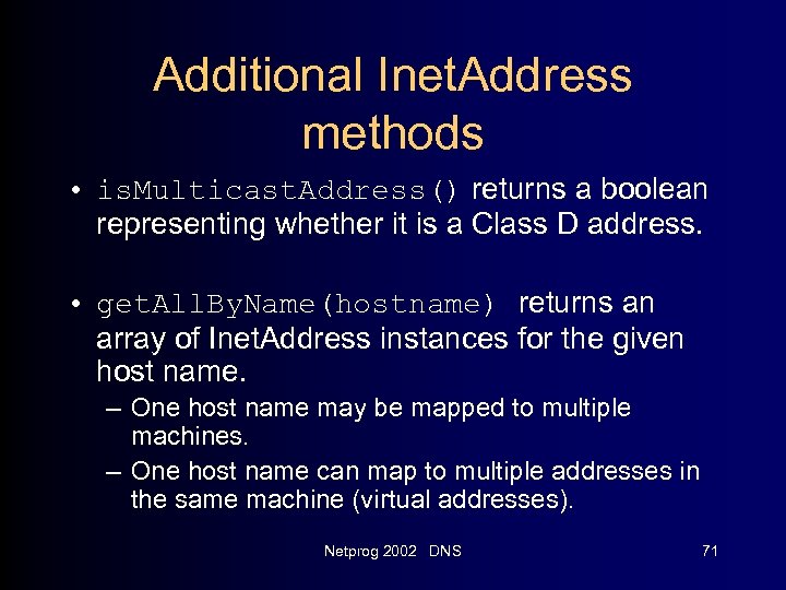 Additional Inet. Address methods • get. Address() returns the IP address. – in byte array format (network byte order), with highest byte at bytearray[0]. • get. All. By. Name(hostname) returns an array of Inet. Address instances for the given host name. – One host name may be mapped to multiple machines. – One host name can map to multiple addresses in the same machine (virtual addresses). Netprog 2002 DNS 70