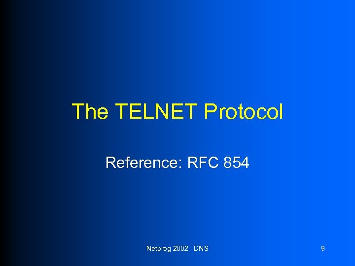 The TELNET Protocol Reference: RFC 854 Netprog 2002 DNS 9
