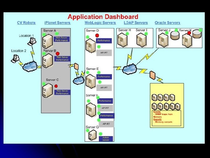 Then Management said… l We need to have a some different dashboard views. l Each level of dashboard gets more detailed. l Special dashboard for outsourced infrastructure. l Dashboards were created using the integrated VISIO (Vantage Visualizer) piece of the product.