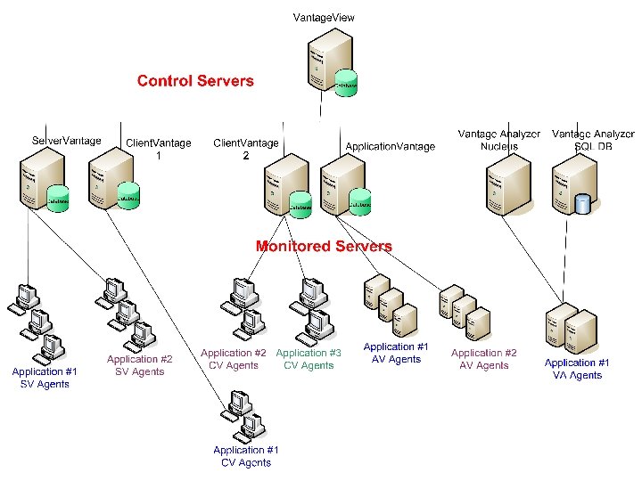 Server. Vantage (SV) • Collects “server” level data. – Multiplatform: Windows, LINUX, UNIX, etc. – CPU, memory, disk, network out of the box. • Collects “application” level data. – Oracle, SQL server, Web. Logic, IPlanet, LDAP, etc. • One SV agent installed on each client server. – Runs most of the time. • Customized counters (metrics) can be written.