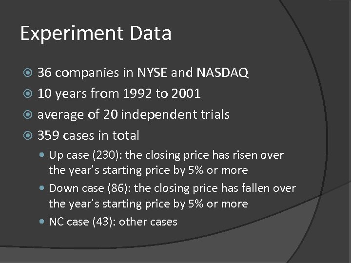 Experiment Data 36 companies in NYSE and NASDAQ 10 years from 1992 to 2001 average of 20 independent trials 359 cases in total Up case (230): the closing price has risen over the year’s starting price by 5% or more Down case (86): the closing price has fallen over the year’s starting price by 5% or more NC case (43): other cases