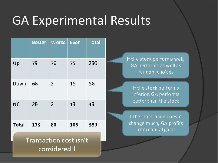 GA Experimental Results Better Worse Even Total Up 79 76 75 230 Down 66 2 18 86 NC 28 2 13 43 Total 173 80 106 Transaction cost isn’t considered!! 359 If the stock performs well, GA performs as well as random choices If the stock performs inferior, GA performs better than the stock If the stock price doesn’t change much, GA profits from capital gains