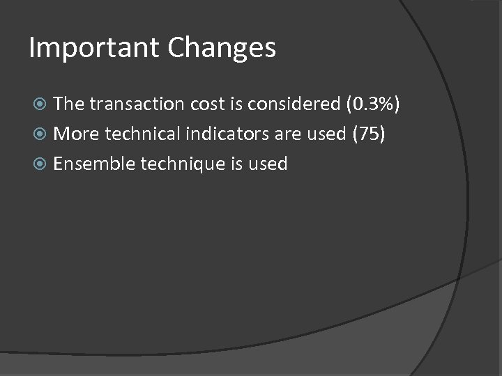 Important Changes The transaction cost is considered (0. 3%) More technical indicators are used (75) Ensemble technique is used