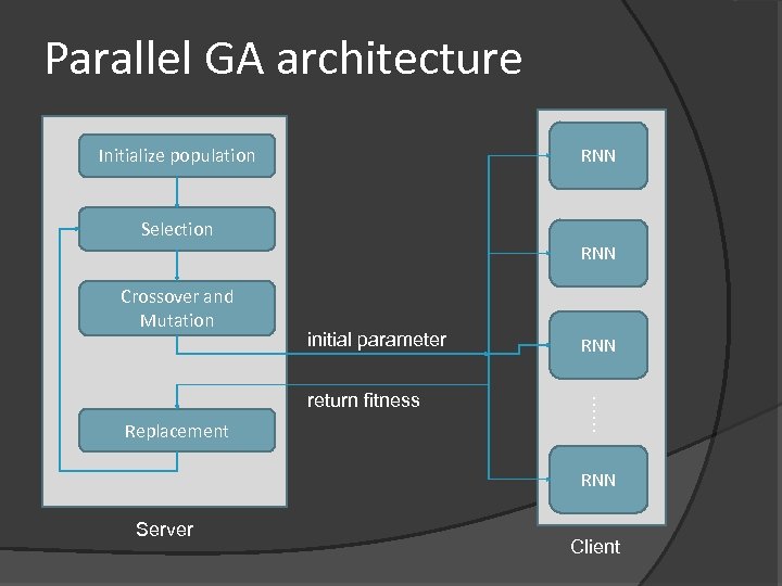 Parallel GA architecture Initialize population RNN Selection RNN Crossover and Mutation initial parameter Replacement …… return fitness RNN Server Client