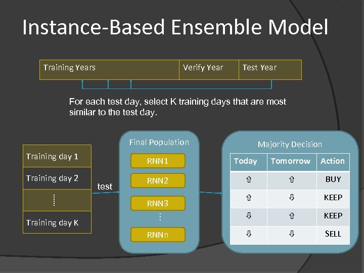 Instance-Based Ensemble Model Training Years Verify Year Test Year For each test day, select K training days that are most similar to the test day. Final Population Training day 1 …… Training day K test Tomorrow Action BUY KEEP … Training day 2 RNN 1 Majority Decision KEEP RNNn SELL RNN 2 RNN 3 Today
