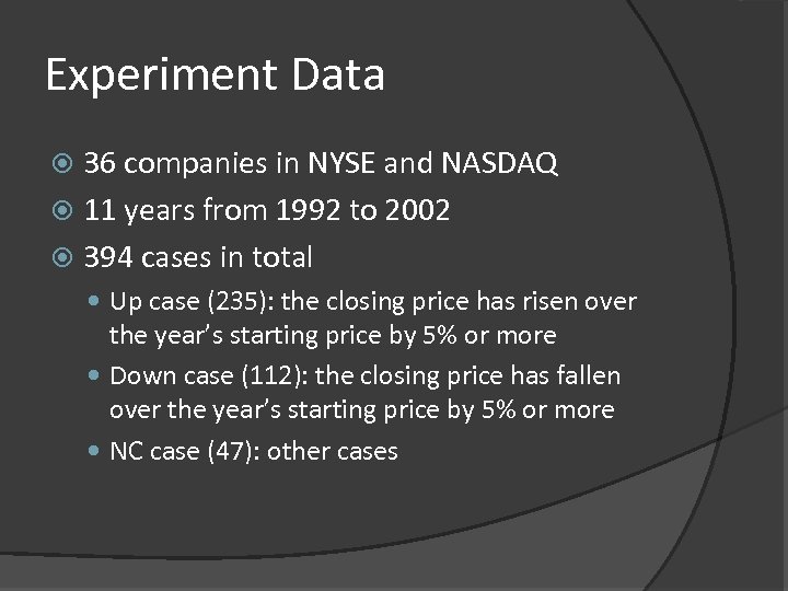 Experiment Data 36 companies in NYSE and NASDAQ 11 years from 1992 to 2002 394 cases in total Up case (235): the closing price has risen over the year’s starting price by 5% or more Down case (112): the closing price has fallen over the year’s starting price by 5% or more NC case (47): other cases