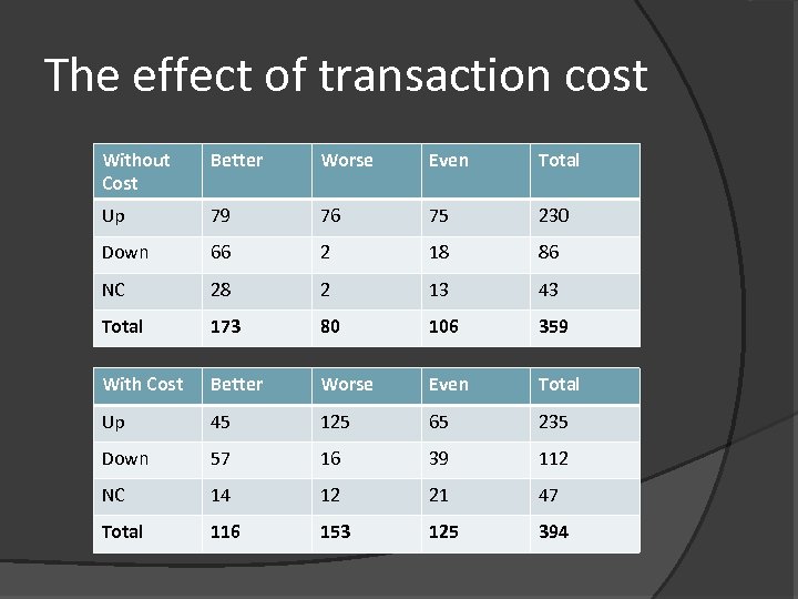 The effect of transaction cost Without Cost Better Worse Even Total Up 79 76 75 230 Down 66 2 18 86 NC 28 2 13 43 Total 173 80 106 359 With Cost Better Worse Even Total Up 45 125 65 235 Down 57 16 39 112 NC 14 12 21 47 Total 116 153 125 394