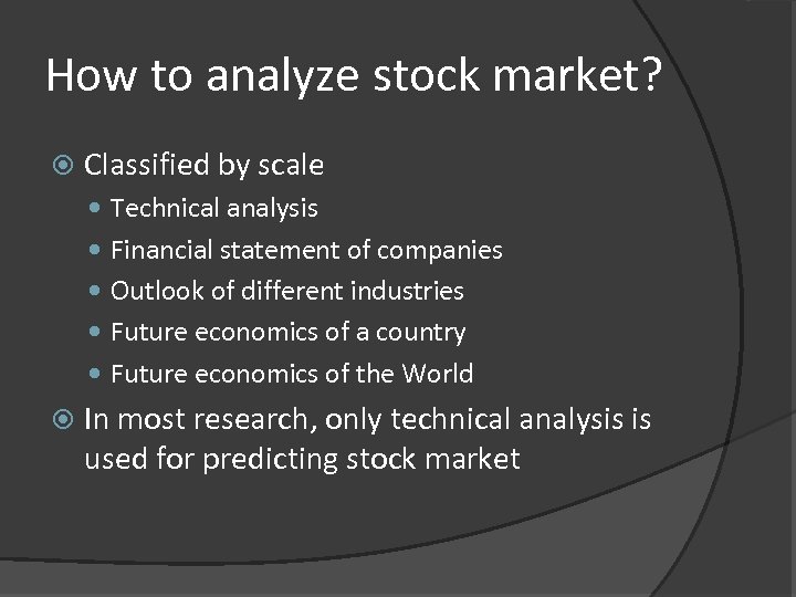 How to analyze stock market? Classified by scale Technical analysis Financial statement of companies Outlook of different industries Future economics of a country Future economics of the World In most research, only technical analysis is used for predicting stock market