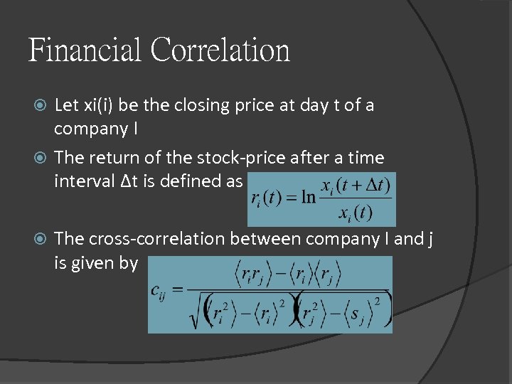 Financial Correlation Let xi(i) be the closing price at day t of a company I The return of the stock-price after a time interval Δt is defined as The cross-correlation between company I and j is given by