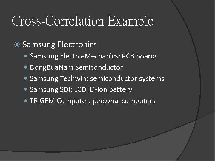 Cross-Correlation Example Samsung Electronics Samsung Electro-Mechanics: PCB boards Dong. Bua. Nam Semiconductor Samsung Techwin: semiconductor systems Samsung SDI: LCD, Li-ion battery TRIGEM Computer: personal computers