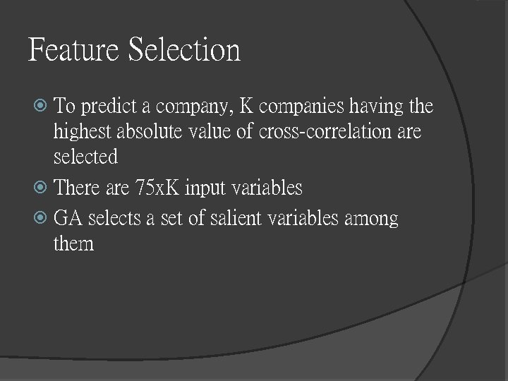 Feature Selection To predict a company, K companies having the highest absolute value of cross-correlation are selected There are 75 x. K input variables GA selects a set of salient variables among them